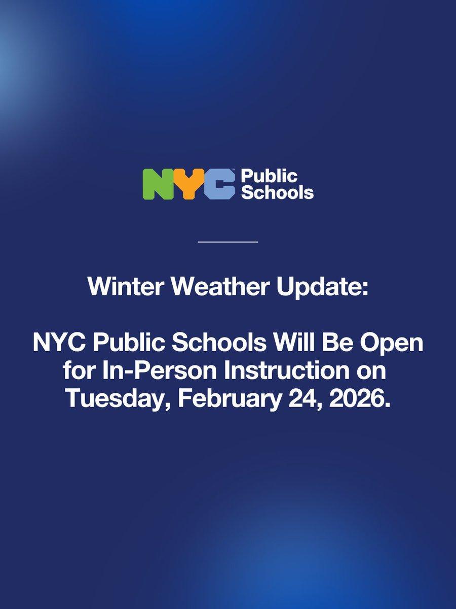 NYC Public Schools will be OPEN for in-person instruction on Tuesday, February 24, 2026.
